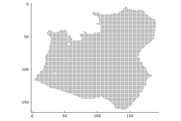 grid = Grid(nx = nx, ny = ny, nσ = nσ, x0 = x0, y0 = y0, dx = dx, dy = dy, h_mask = hm, u_iszero = u_iszero, v_iszero = v_iszero)Before moving on, let's have a look at the h_mask (i.e. which grid points are in the domain) using the spy function, which indicates which entries of a matrix are non-zero: