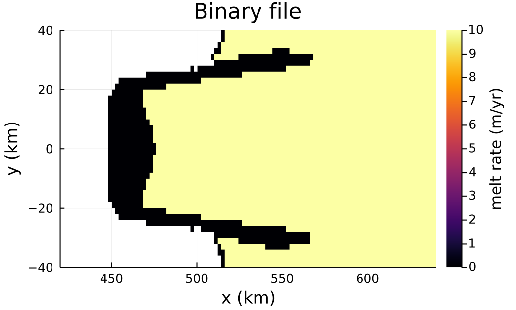 Finally, a binary file melt rate, in which the melt rate is read in from a binary file. First, we'll create such a file, which will set the melt rate to be uniform on the shelf.