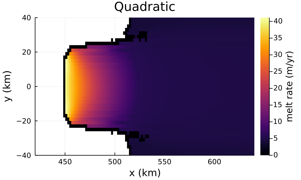 melt_quad = QuadraticMeltRate(γT = 0.745*1e-3)The parameter $\gamma_T$ is a normalization cofficient. The value here is chosen so that the mean melt rate on the shelf is approx 10m/a. (See the "WAVI Setup" –> "Melt Rate Models" section for information on all keyword parameters, here and for the below models.)