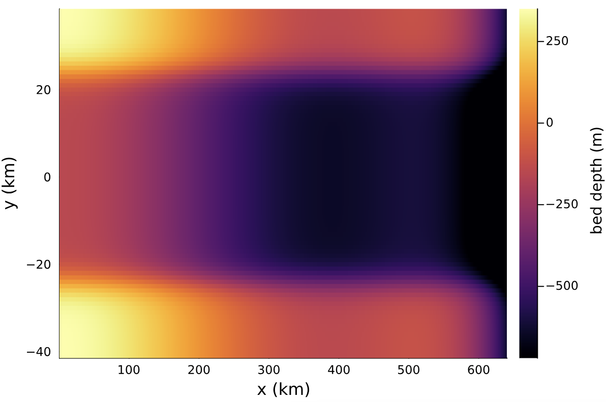 This example shows how to recreate the Marine Ice Sheet Model Intercomparison (MISMIP) (doi: 10.5194/tc-14-2283-2020) experiments. In this intercomparison exercise, a two-dimensional ice sheet is considered, with a grounding line that can stabilize on a section of bed which has a locally positive slope in the flow direction (commonly called retrograde). This is interesting because grounding lines on retrograde bedslopes are theoretically unstable in one horizontal dimension (see doi: 10.1029/2006JF000664), demonstrating the importance of variations in the second dimension for buttressing ice sheets. Note that here we use a very coarse (8km) resolution for computational speed. In this example, we demonstrate the MISMIP+ ice0 experiment, where the simulation is run to steady state with no melting; the other MISMIP+ experiments are shown in other examples.