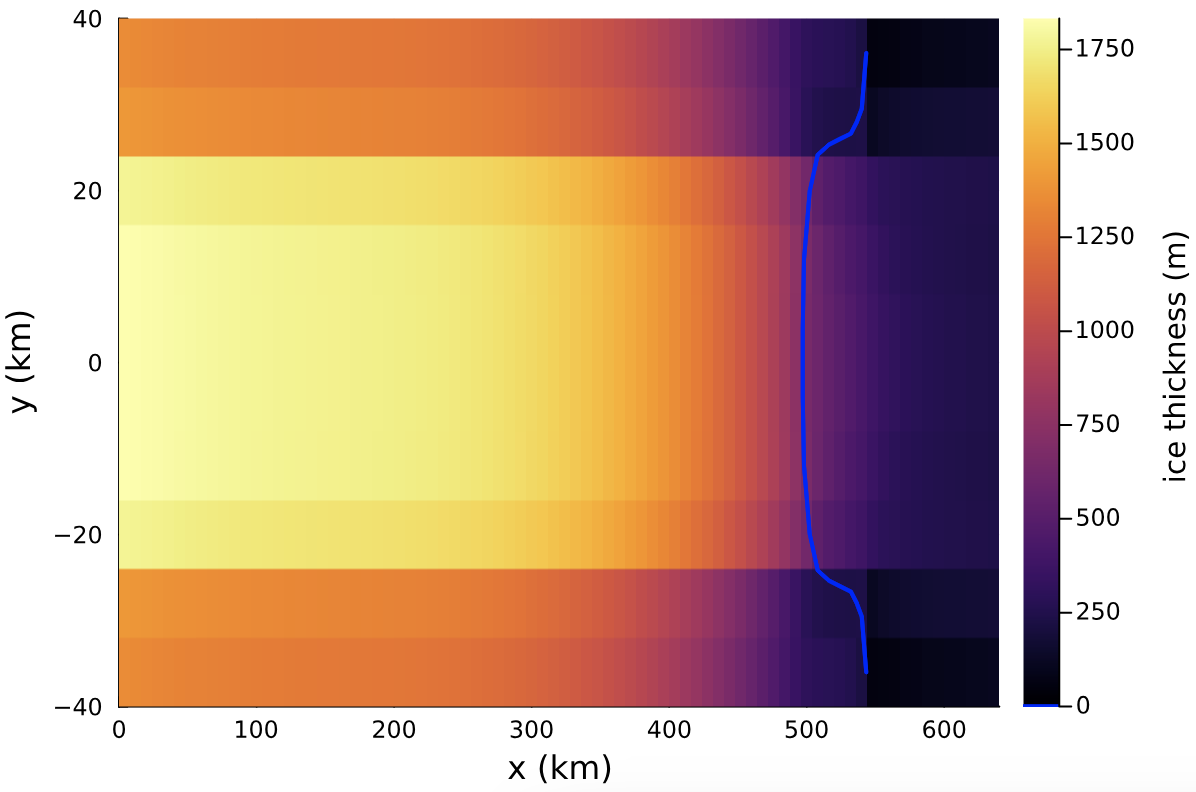 plot!(size = (600,400))You can see, by comparing with the plot of the bed earlier, that the grounding line sits on an overdeepened section of the bed! You can also compare it with the other MISMIP submissions (figure 3 in Cornford et al., 2020) and see that the grounding line position agrees pretty well with other models, despite being lower resolution.