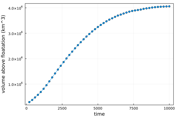framestyle = :box)The volume above floatation reaches a plateau, suggesting that we have indeed reached a steady state.