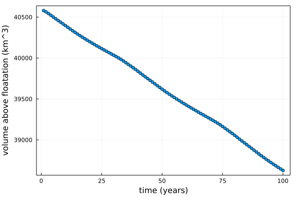 run_simulation!(simulation)Let's plot the volume above floatation through time (volume above floatation is the volume of ice above the thickness set the Archimedean floatation condition).